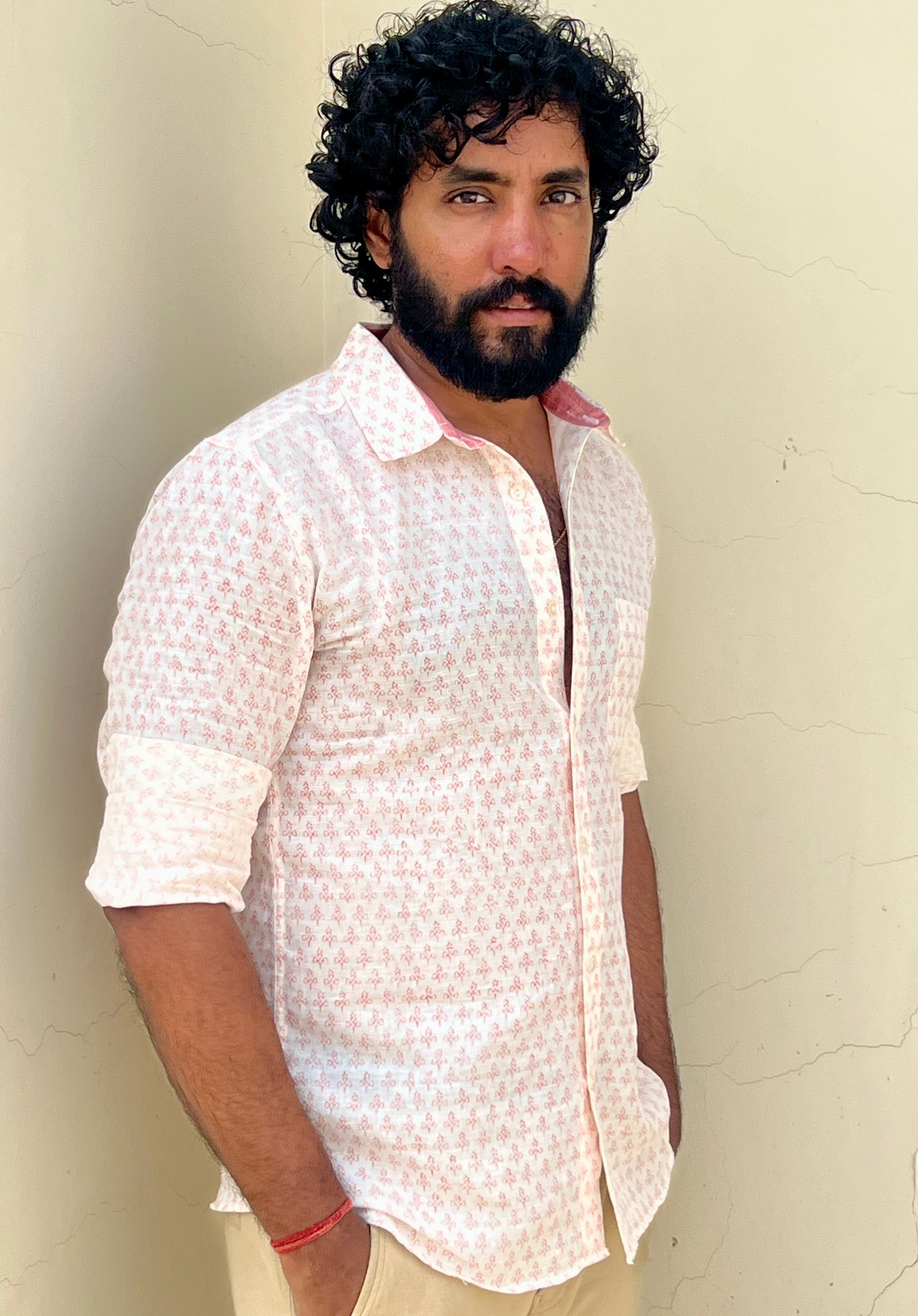 Pure linen-cotton shirt featuring traditional handblock Booti prints. Crafted for comfort and style, this breathable shirt is perfect for everyday wear or casual outings. Each piece is hand-printed, making every shirt unique.